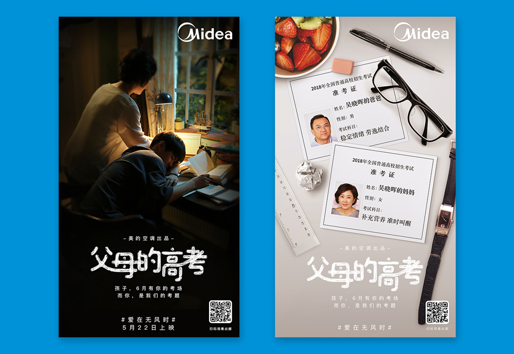 美的无风感空调,已围绕“无风感,有情感”概念进行了长达一年的传播。高考季是这款产品的英雄季,无风感制凉,能避免考生感冒,让父母安心。高考主题每年必谈,所以在接到传播Brief时,面临挑战是,怎样有新意地讲故事?